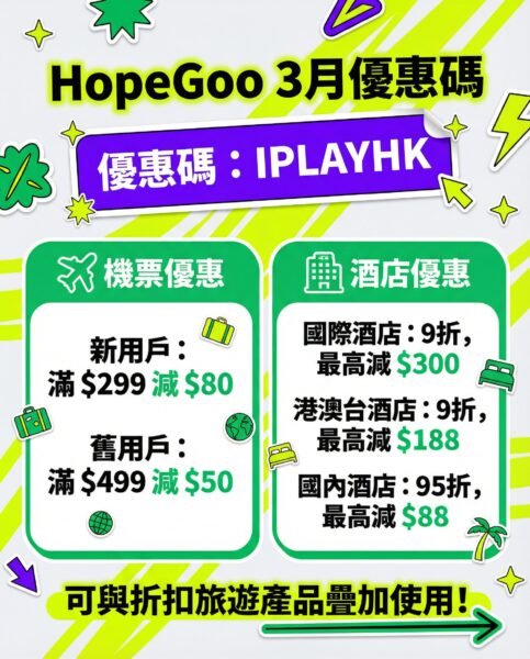 - 限時用呢條Link 登記 HopeGoo 新account ,輸入「iplayhk」獲取優惠券,即有至抵優惠券!買機票即減$200! 酒店9折!