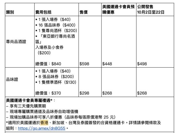 美國運通卡會員仲有專屬禮遇,包括三天優先購票期(美國運通卡會員預購價448元(尊尚品酒證)/預購價268元(品味證))、現場專屬購票通道同品味券自助增值機,現場加購品味券仲有八折優惠!詳情可以睇返條款同細則:https://go.amex/dn8G55。